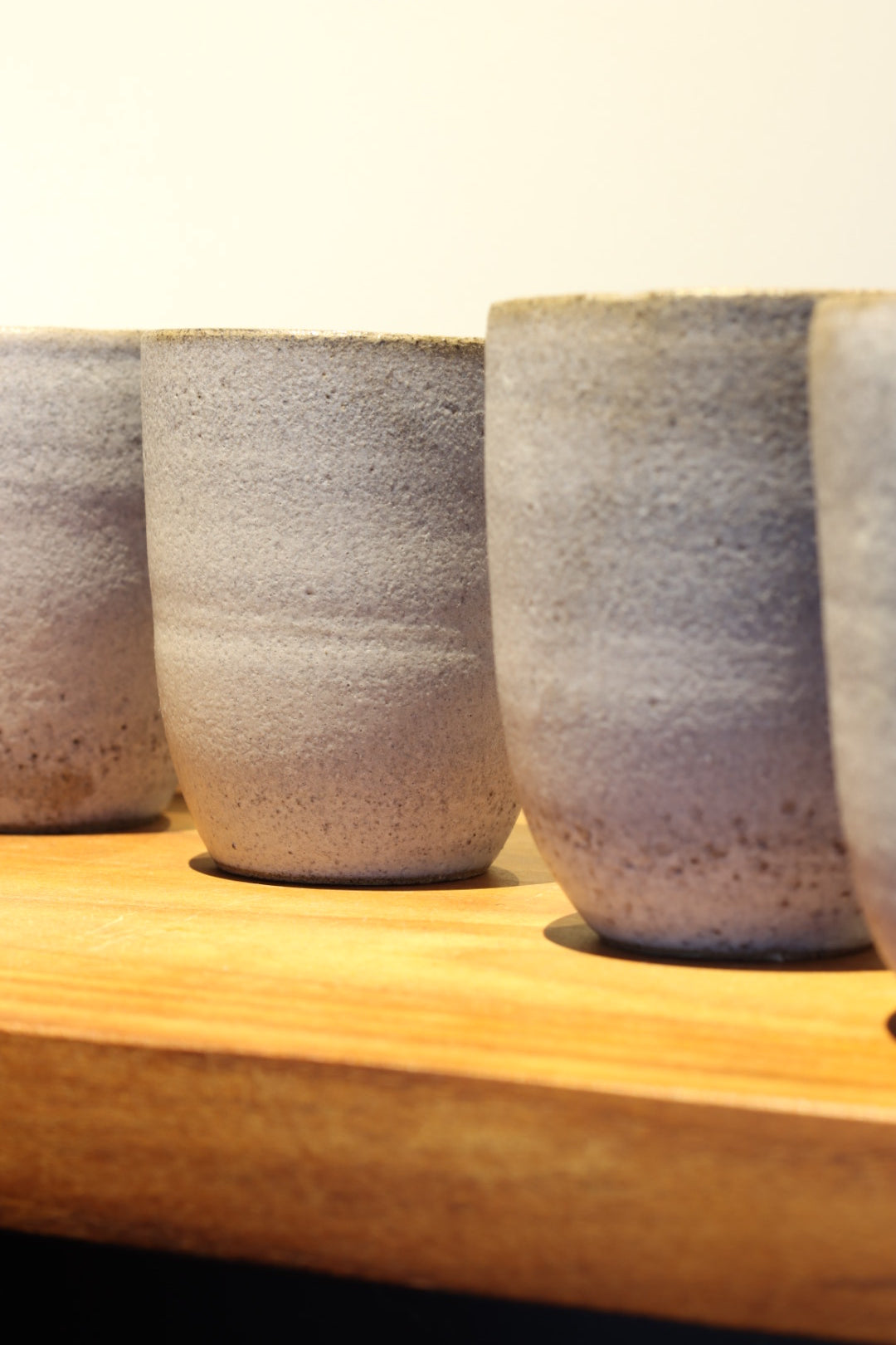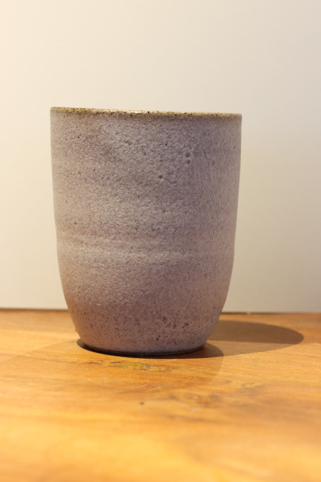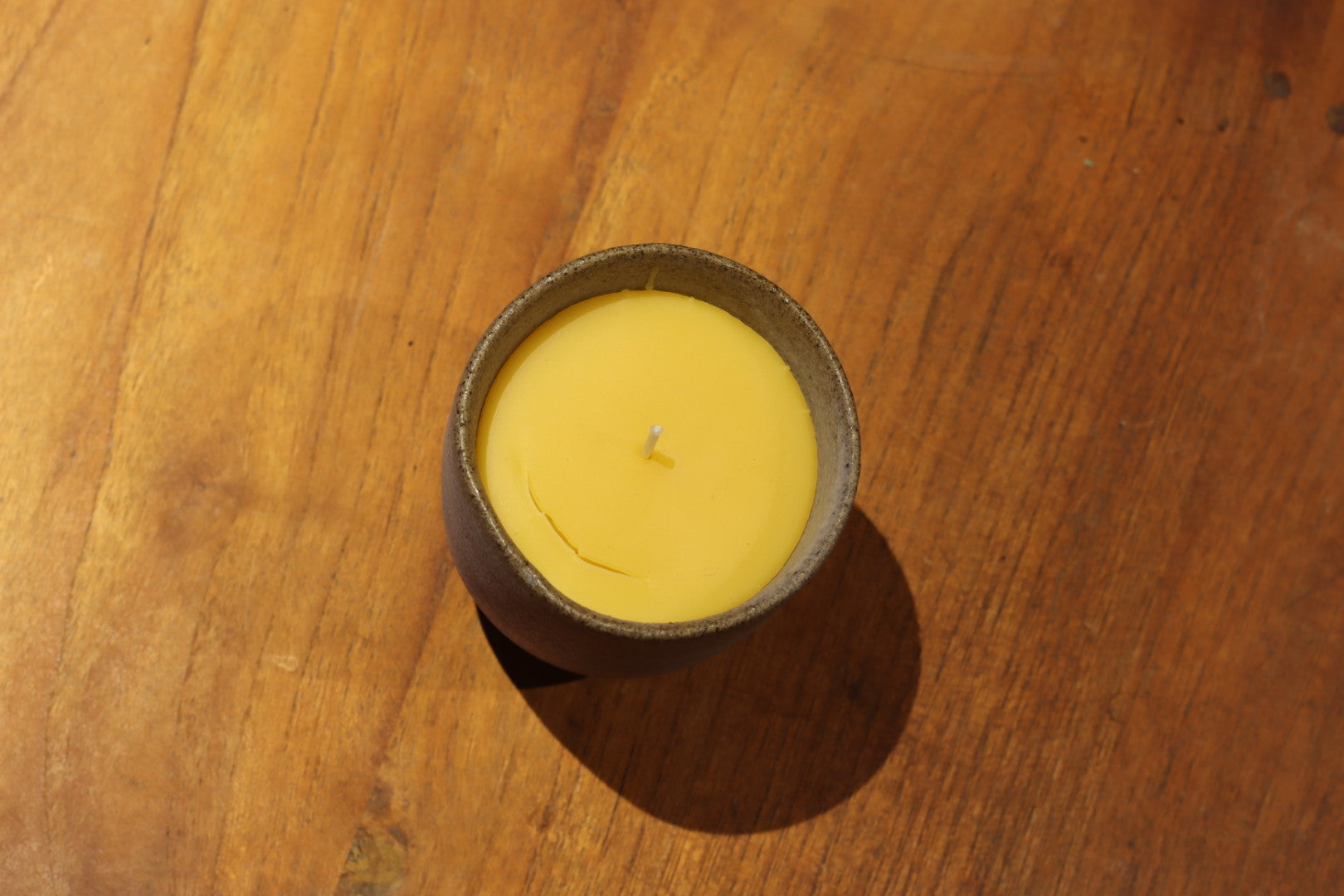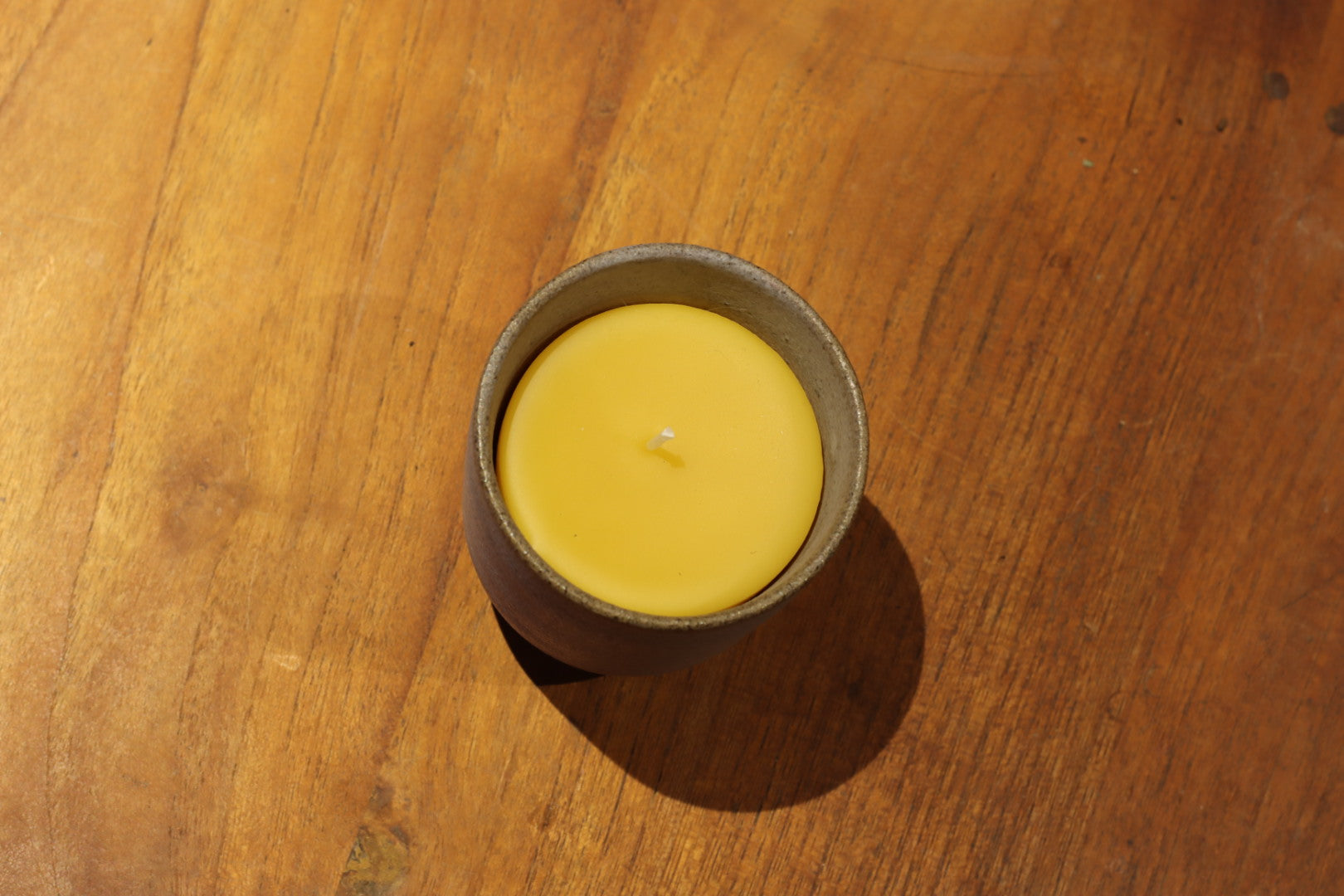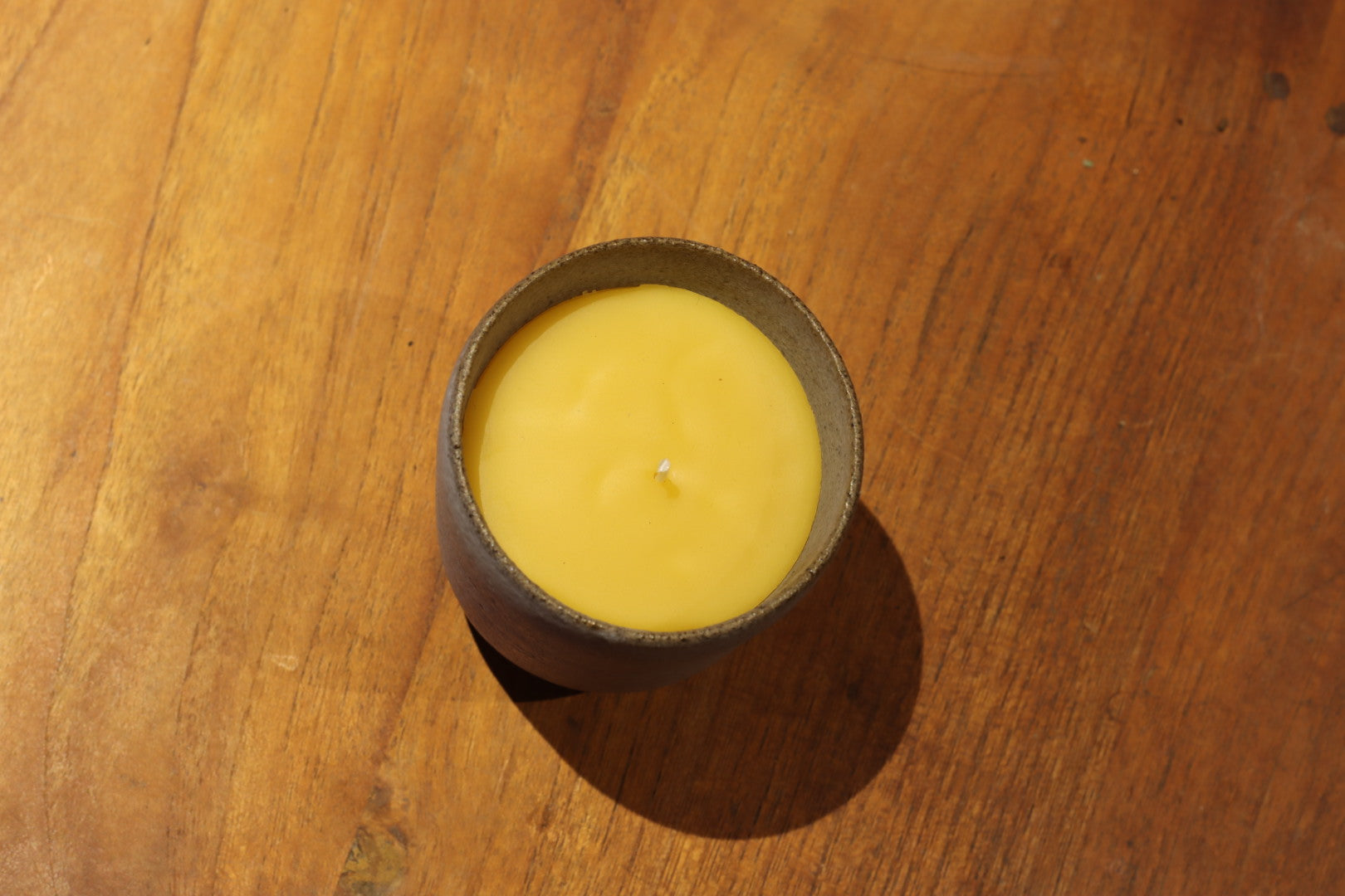 Deze kaars gemaakt van bijenwas zit in een zelfgemaakte keramiek mok.